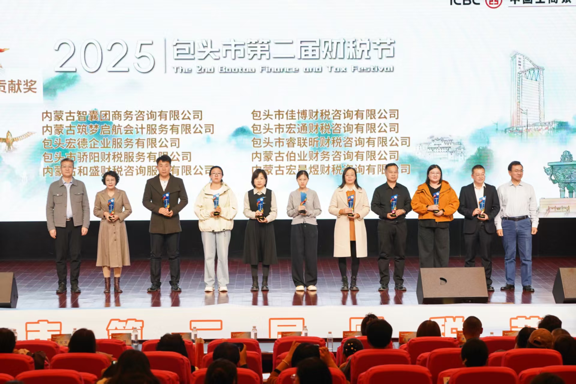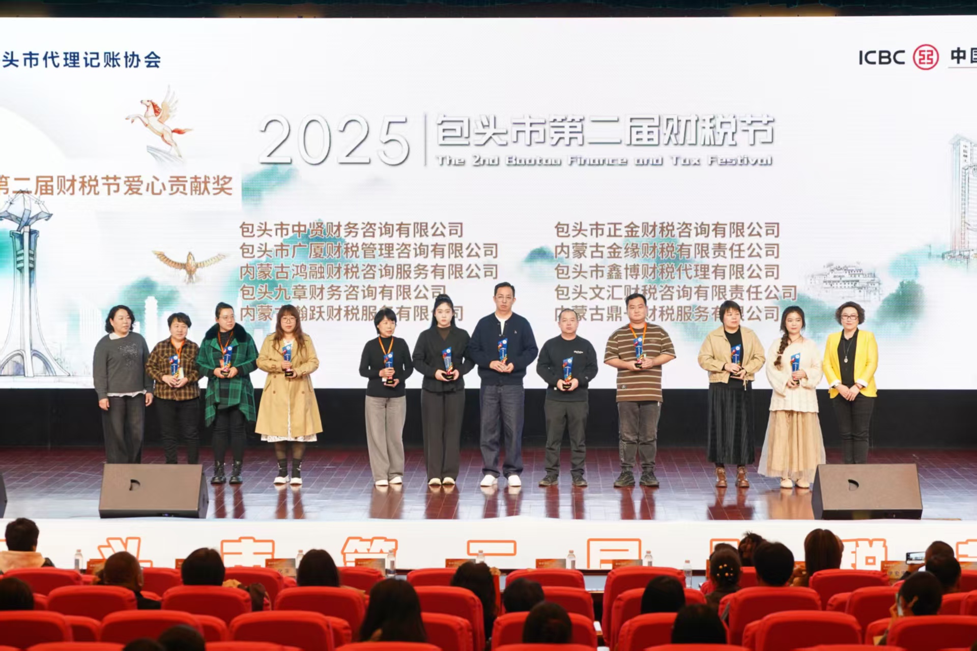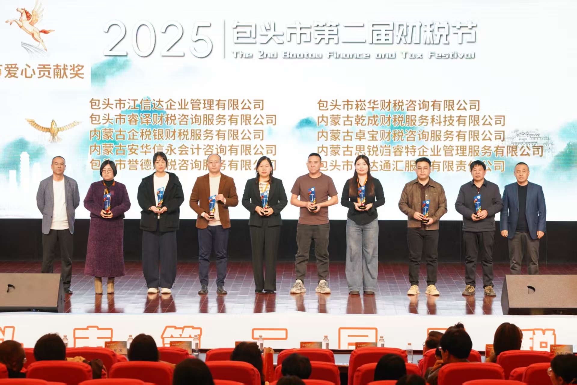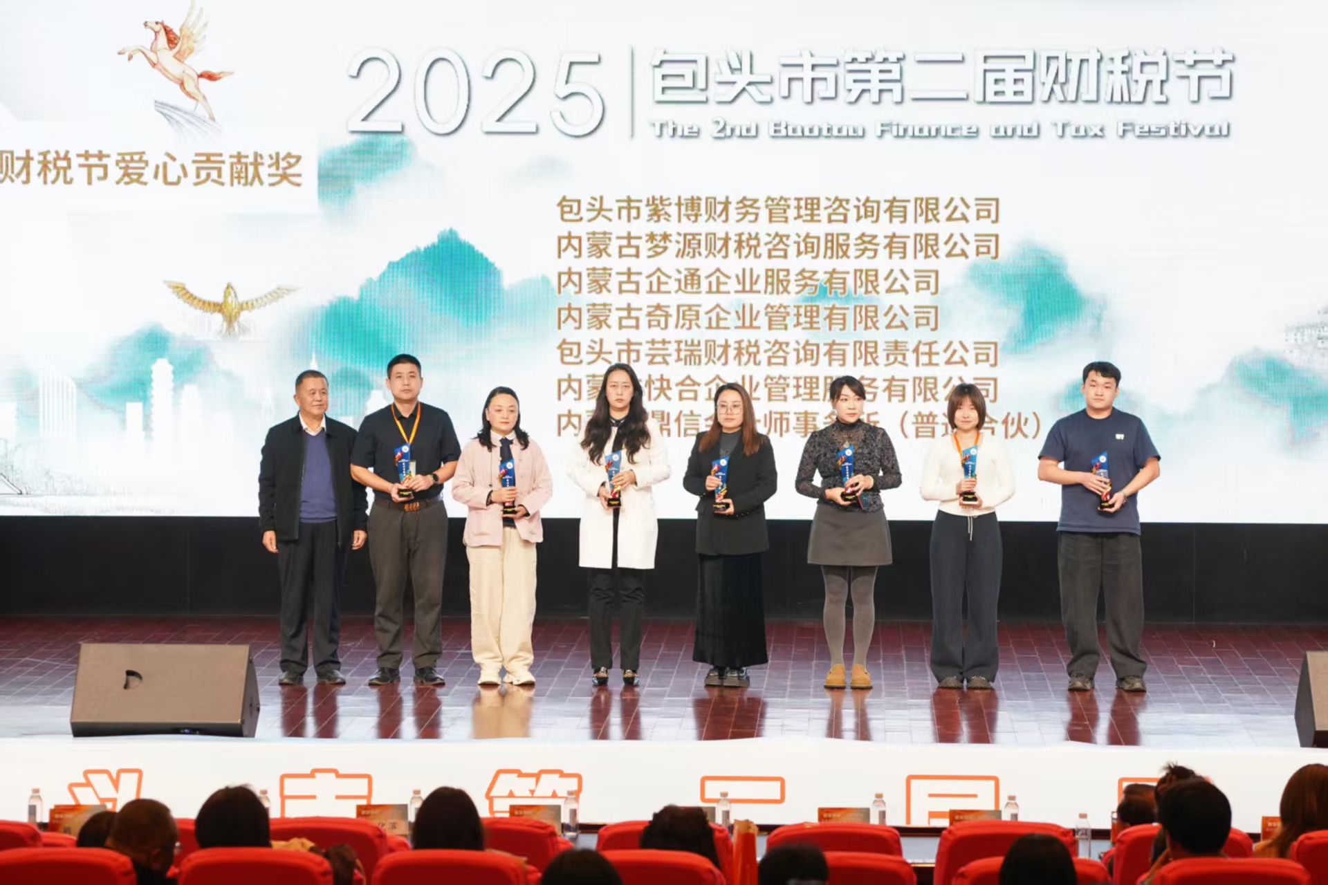 包头市注册会计师协会秘书长苗宇光、包头市互联网行业联合会秘书长王建文,达拉特旗代理记账协会会长徐秀梅、包头市女企业家协会执行会长王建平,包头市创业者协会会长伊宏宇、包头市电商商会会长赵奇,包头市工艺礼品行业协会秘书长王桂凤、包头建筑工程协会秘书长郝宝中,包头市民办教育协会理事长郝金良等嘉宾先后为获奖企业颁奖。现场掌声不断,见证着财税人践行社会责任的坚定步伐。