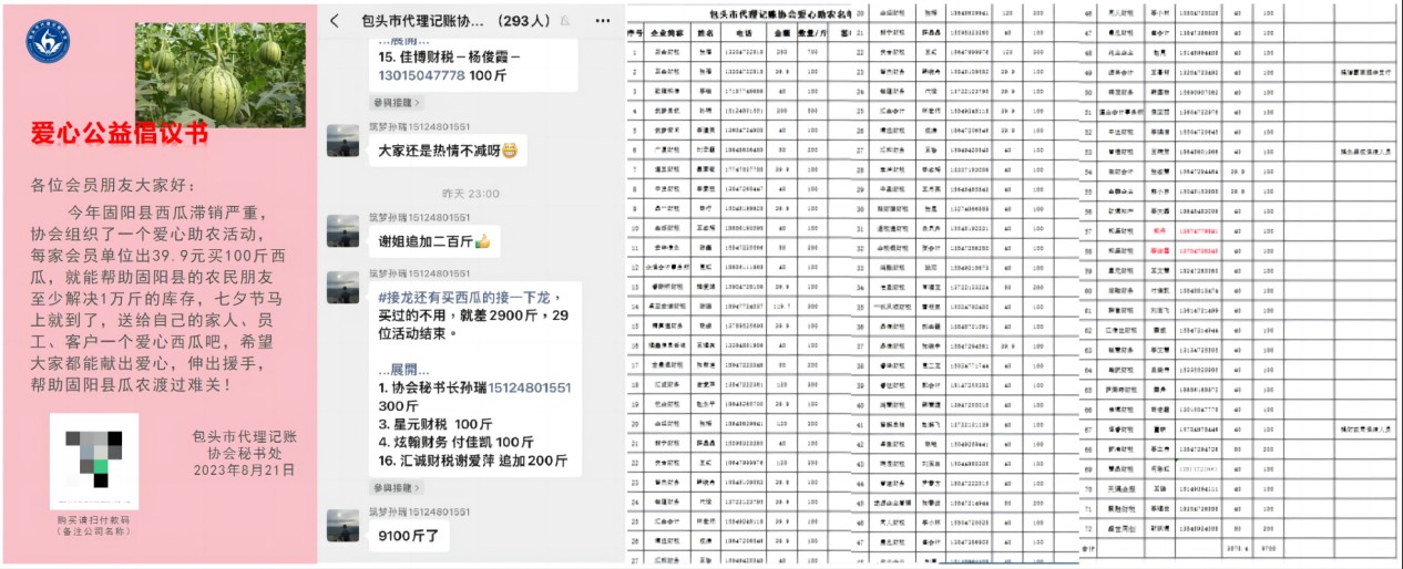 接到市党建联盟倡议,包头市代理记账协会党支部第一时间号召协会会员单位以及行业内其他单位积极认购,助农增收。此次共购买滞销西瓜12000斤,累计75家爱心企业奉献爱心,在这场活动中,有的企业不在包头市区也参与了采购,嘱付协会捐赠给困难群体,有的企业为了固阳农户多次采购,协会会长更是带头采购700斤送给员工,在这次活动中涌现出了很多感人的故事,体现了包头市代理记账协会会员们无私善良,友爱互助的精神力量!